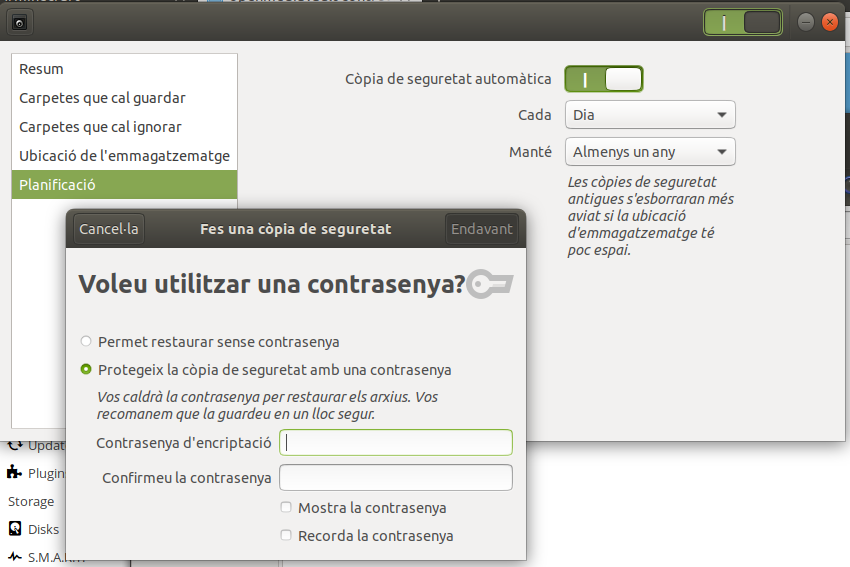 Para la planificación le diremos que mantenga las copias durante un año y que las haga cada dia, al hacer la copia de seguridad nos pedira que pongamos una contraseña para cuando tengamos que restaurar la copia de seguridad, podemos ponerle una contraseña o decirle que no la queremos.